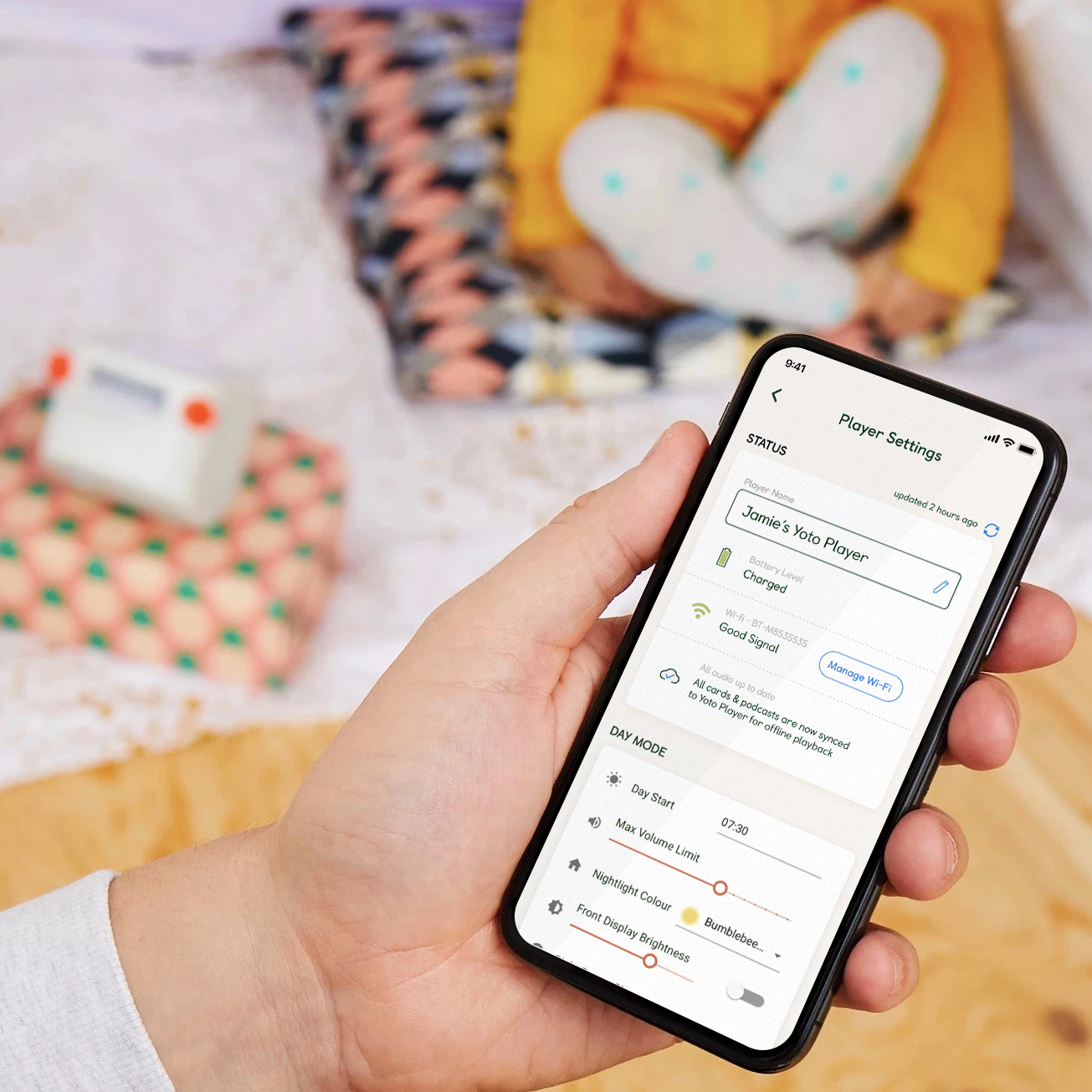 The Yoto App helps get your Player online so it can play cards. Then use it to manage settings on the Player and see and play all your cards.